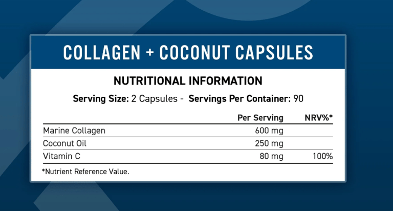 Hydrolysed Marine Collagen (Fish), Coconut Oil Powder (Cocos Nucifera), Capsule [Hydroxypropyl Methylcellulose, Colour (Brilliant Blue)], Vitamin C (as Ascorbic Acid), Anti-Caking Agents (Silicon Dioxide, Magnesium Stearate).