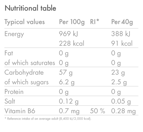 Glucose Syrup, Water, Maltodextrin, Acidity Regulators (Sodium Citrates, Citric Acid), Preservatives (Potassium Sorbate, Sodium Benzoate), Natural Flavourings, Sea Salt, Vitamin B6.
